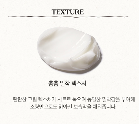 - 촘촘 밀착 텍스처 : 탄탄한 크림 텍스처가 사르르 녹으며 농밀한 밀착감을 부여해 소량만으로도 얇아진 보습막을 채워줍니다.